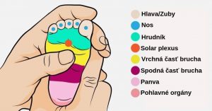 - Bod pod priehlavkom, stred chodidla – problémy v strede brušnej dutiny.