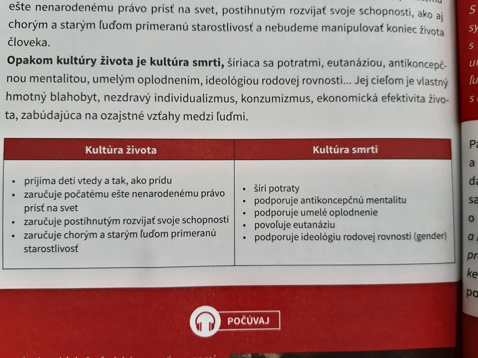 Na facebookovej stránke Zolko sa objavila fotografia učebnice náboženstva pre 8. triedu základných škôl. Na jednej zo strán bola tabuľka, ktorá rozdeľovala ľudí na vyznávačov „kultúry života“ a „kultúry smrti“. Táto učebnica je hradená Ministerstvom školstva, vedy, výskumu a športu SR. Učebné plány, osnovy a taktiež autorov a obsah učebníc schvaľuje Konferencia biskupov Slovenska.