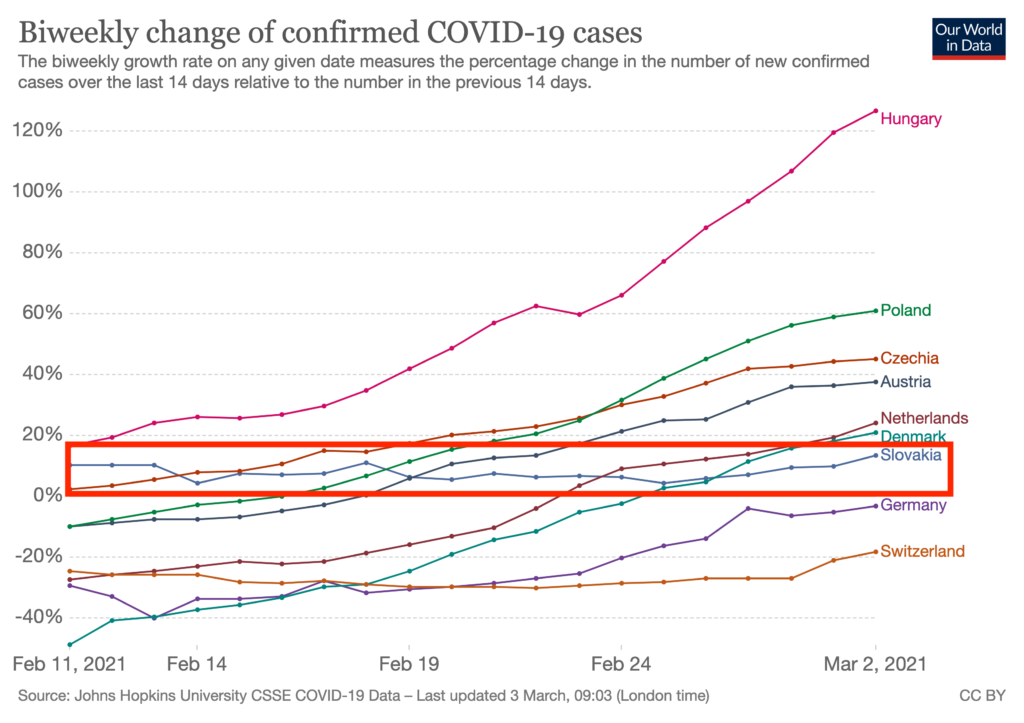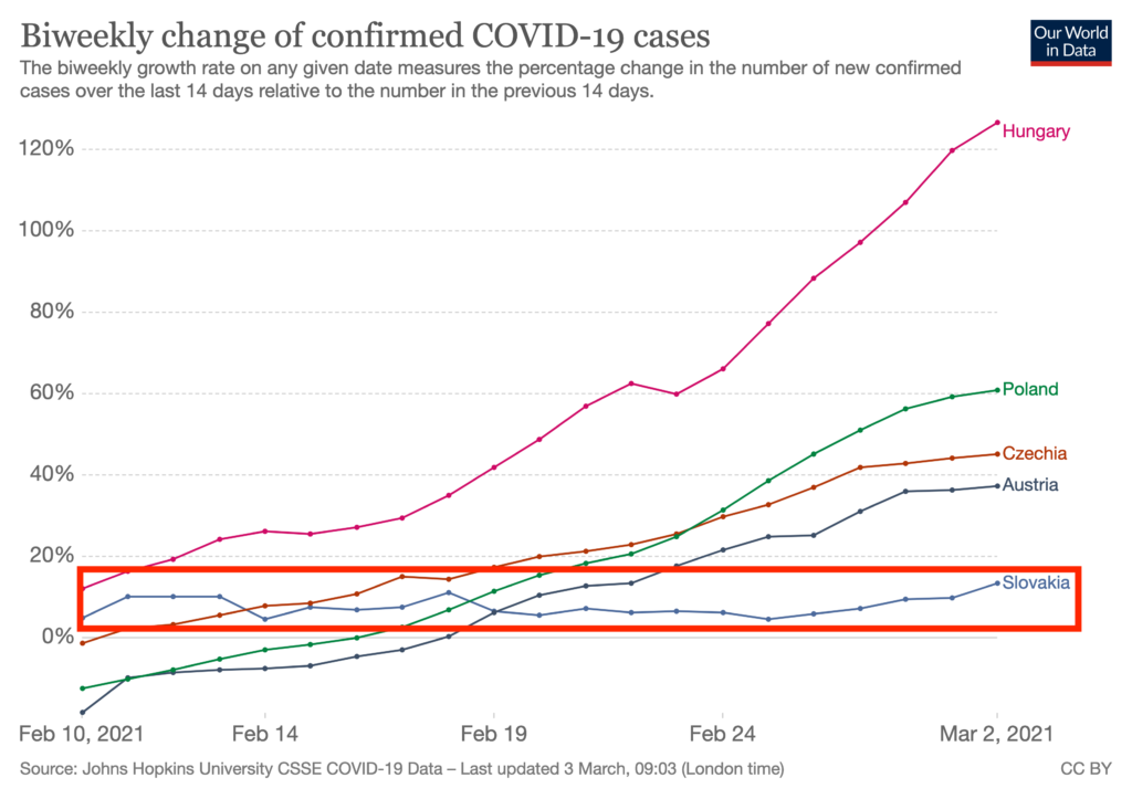 Na druhej strane však porovnali akým tempom rastie počet nakazených u nás, v susedných štátoch a krajinách, ktoré pred Vianocami boli na tom rovnako.
