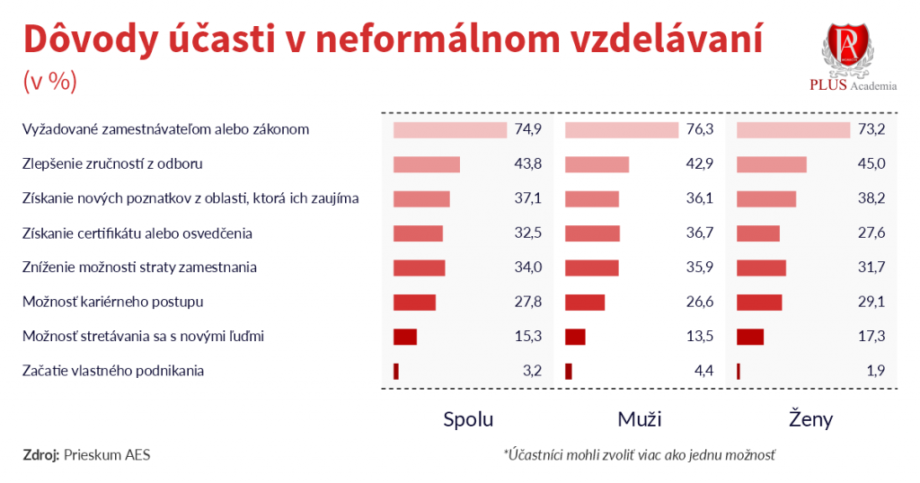 Ako vyplýva z prieskumu, motiváciou účasti na neformálnom vzdelávaní je najmä zlepšenie zručností z odboru (43,8%), získanie nových poznatkov z oblasti, ktorá ich zaujíma (37,1 %), získanie certifikátu alebo osvedčenia (32,5%). U tretiny zamestnancov ide o predídenie pred stratou zamestnania (34%) alebo o kariérny postup (27,8%). No jednoznačne najviac zastúpeným dôvodom je vyžadovanie zamestnávateľom alebo zákonom (74,9%).