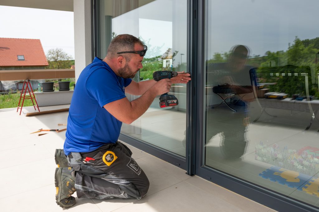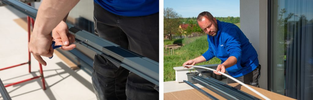 • Technici si označia otvory na vŕtanie a priskrutkujú zostavenú konštrukciu k okennému rámu.