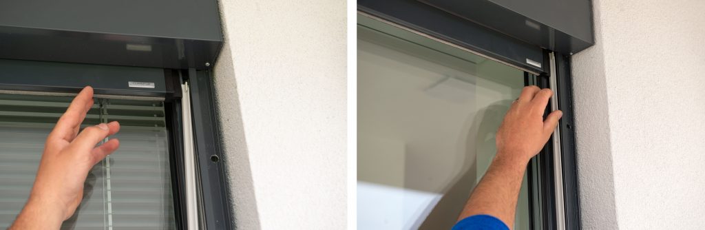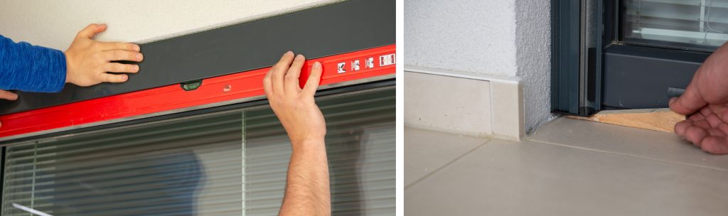 • Pomocou vodováhy sa skontroluje osadenie rolety, ktorú možno vypodložiť pomocnými klinmi.