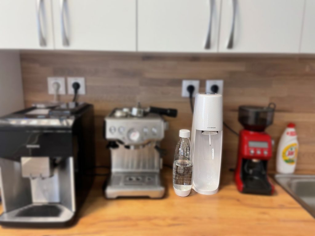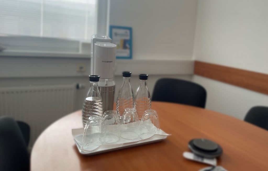 V zasadačkách je k dispozícii SodaStream Crystal so sklenenými fľašami a pohármi.